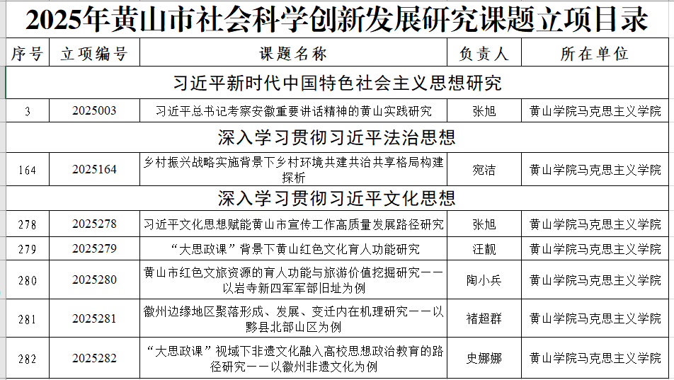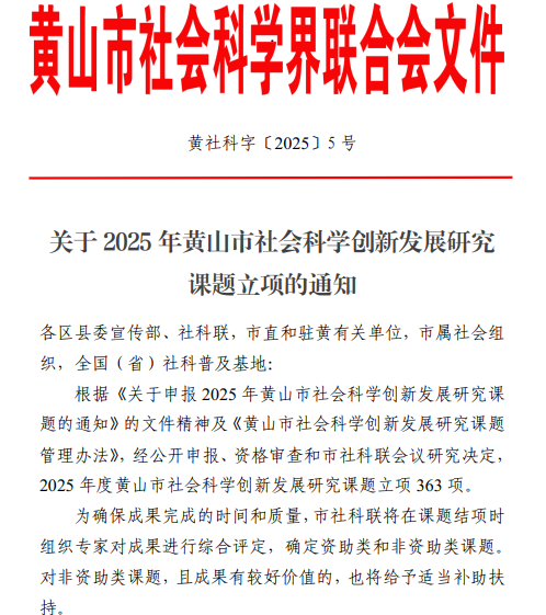近日,2025年黄山市社会科学创新发展研究课题立项结果公布。太阳集团网站8722共有7项课题获批立项,其中“习近平新时代中国特色社会主义思想研究”项目1项,“深入学习贯彻习近平法治思想”项目1项,“深入学习贯彻习近平文化思想”项目5项。