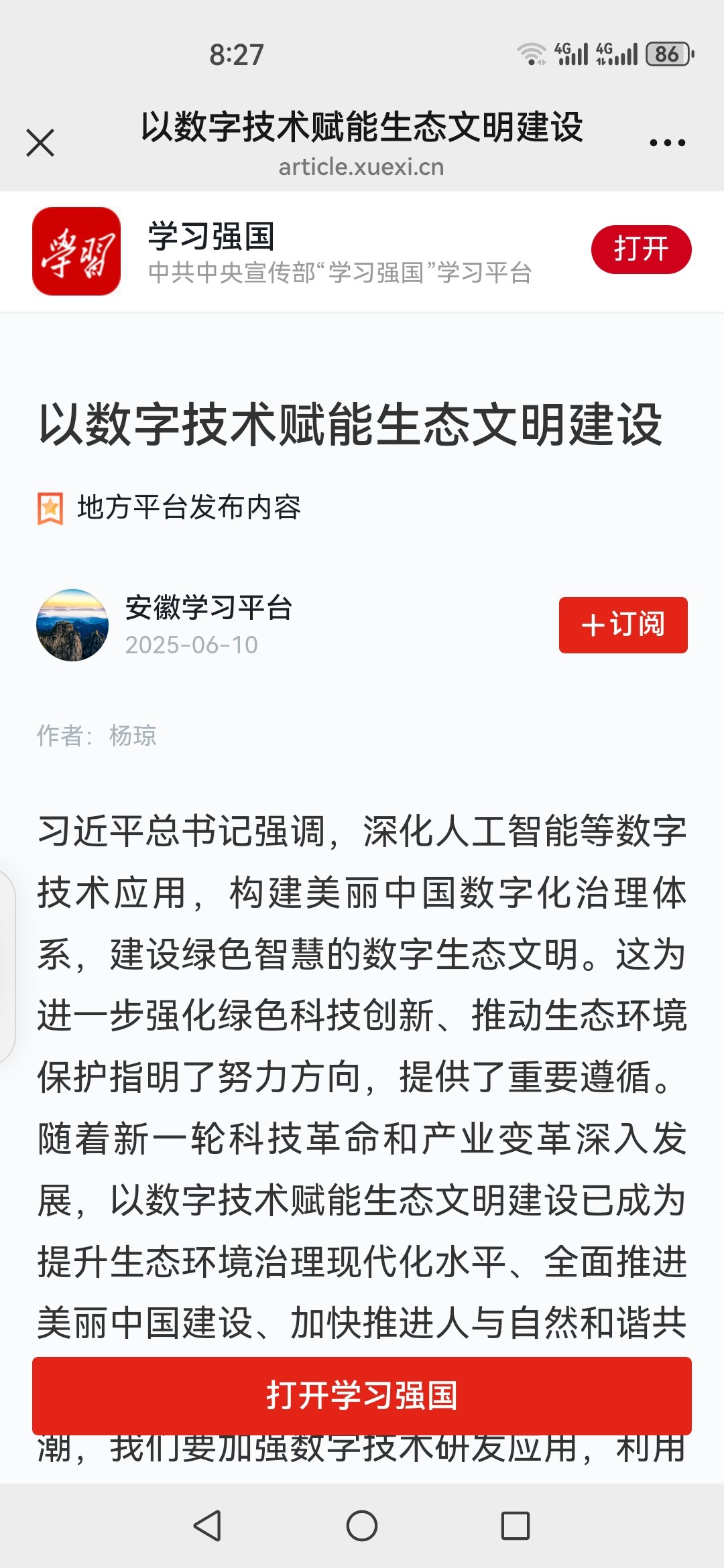 2025年6月10日,太阳集团网站8722杨琼老师撰写的论文《以数字技术赋能生态文明建设》,在安徽日报(理论版)刊发并被“学习强国”安徽平台全文转载,这是我院教师在该平台首次发表推文。