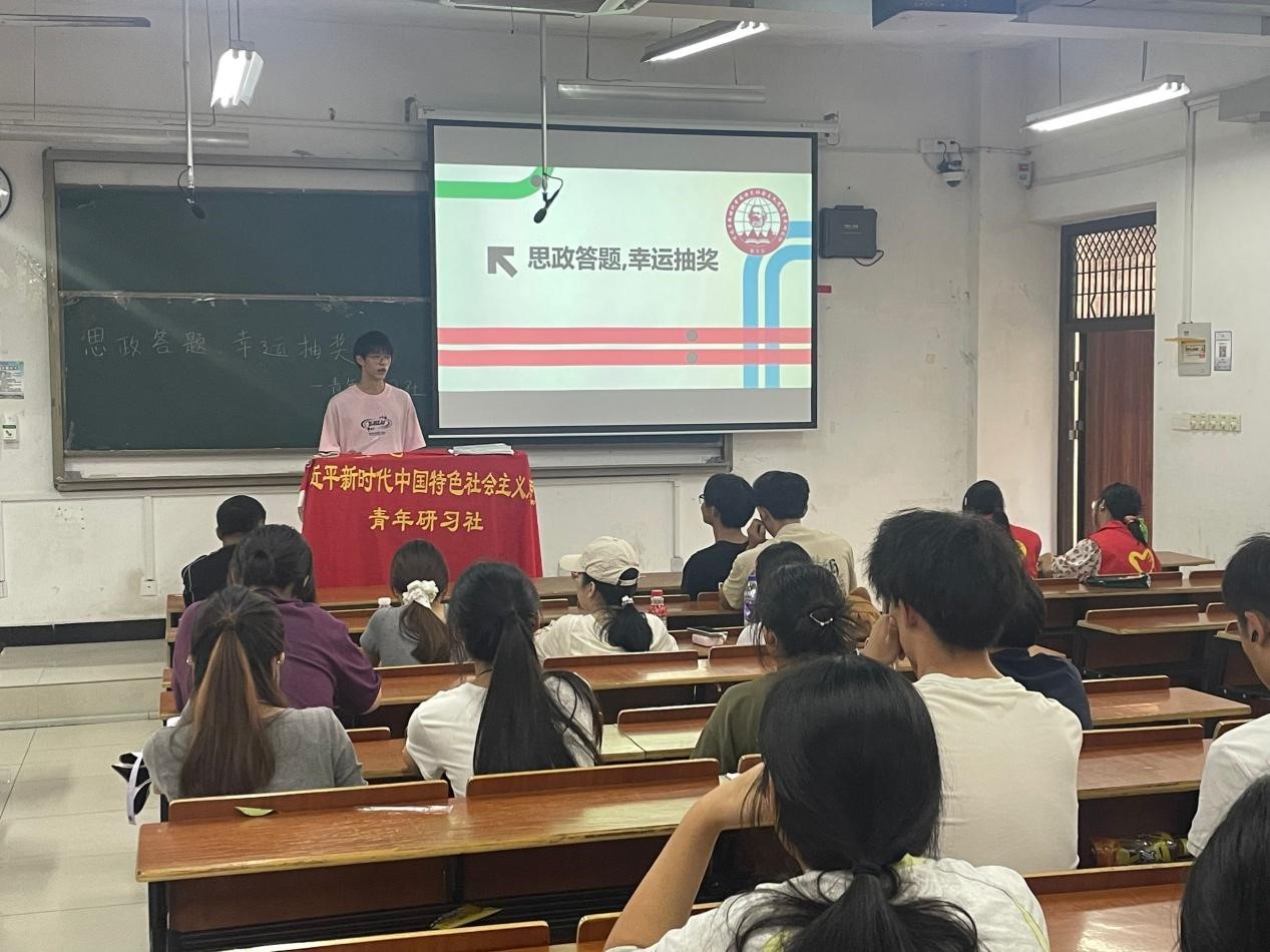 2025年10月11日,tyc8722太阳集团习近平新时代中国特色社会主义思想青年研习社在文渊楼1104教室举办“思政答题大挑战,点亮青春‘政’能量”活动,63名学生参与,通过“答题+抽奖”的趣味形式参与思政知识学习。