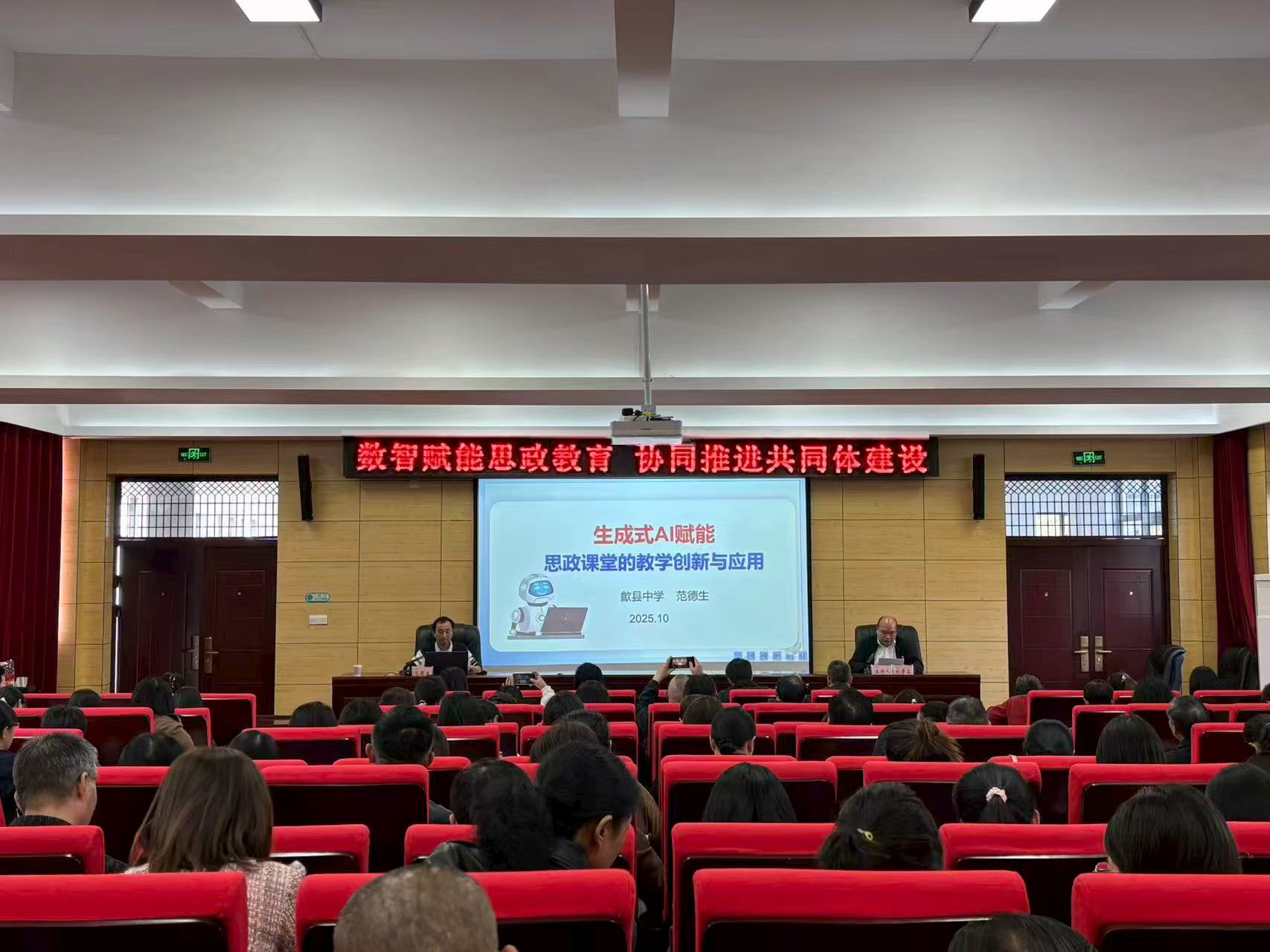 会上,歙县中学信息技术正高级教师、省特级教师、黄山市名师工作室主持人范德生老师作了题为《生成式AI赋能思政课堂的教学创新与应用》的专题报告。报告中,范老师围绕“新技术、新应用、新反思”三个维度展开深入解读。并结合当前教育领域的前沿动态,通过丰富的案例演示,详细介绍了生成式AI在思政课堂教学设计、教学资源开发、教学互动优化以及教学管理等方面的具体应用场景,为在场教师提供了可借鉴、可操作的实践方案。