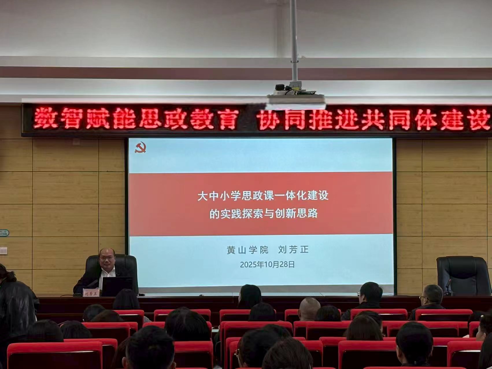 为深入贯彻落实新时代思政课建设要求,推动数智技术与思政教育深度融合,促进大中小学思政课一体化协同发展,10月28日上午,黄山市大中小学思政课一体化共同体单位教师研修培训在我校率水校区文昌楼211会议室成功举办。本次培训会以“数智赋能思政教育 协同推进共同体建设”为主题。会议由太阳集团网站8722院长刘芳正主持。来自全市各大中小学思政课教师120余人参加会议。