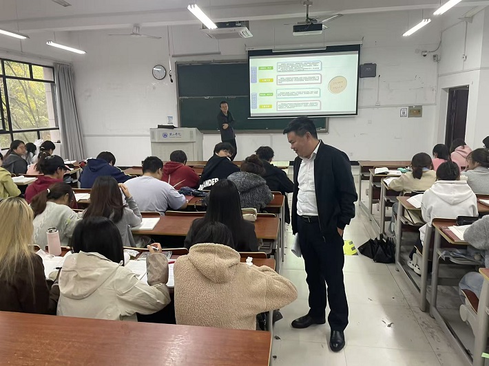 调研过程中,校领导走进思政课堂,全程听取了吴丹、孙玉雯两位教师讲授的《思想道德与法治》课程。课后,校领导与授课教师亲切交流,充分肯定的同时,就课程重难点的讲解逻辑、案例选取的时代性,以及思政元素与知识点的融合深度问题提出指导建议。