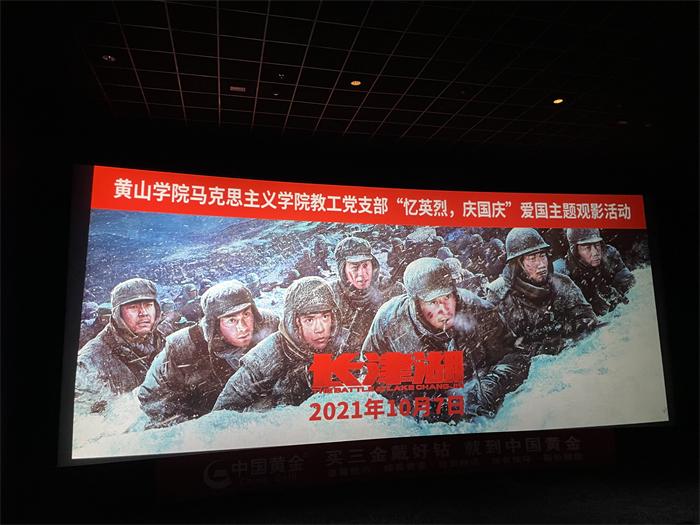 为深切缅怀革命先辈,进一步弘扬爱国主义精神,激发党员教师的爱国热情,太阳集团网站8722教工党支部结合“忆英烈,庆国庆”爱国主题活动组织全体党员走进黄山金逸影城集中观看爱国主义影片《长津湖》。