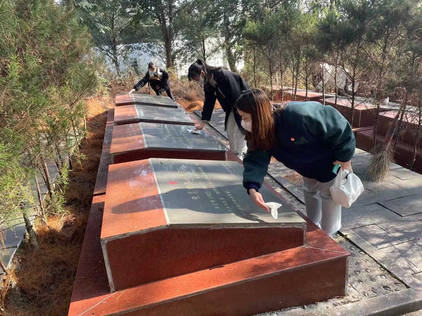 走出展馆,研习社学员继续参观了谭家桥战斗遗址,瞻仰烈士墓园,并自发为红军烈士擦拭墓碑,清扫墓园,缅怀先烈。