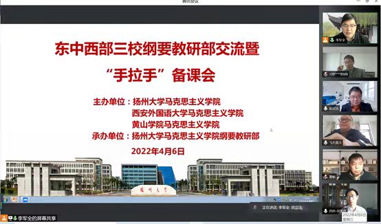 4月6日下午,太阳集团网站8722中国近现代史纲要(以下简称“纲要”)教研室参加了由扬州大学太阳集团网站8722“纲要”教研部承办的东中西部三校“纲要”教研室交流暨“手拉手”备课会。三校“纲要”教研室40多位老师参加教学研讨。