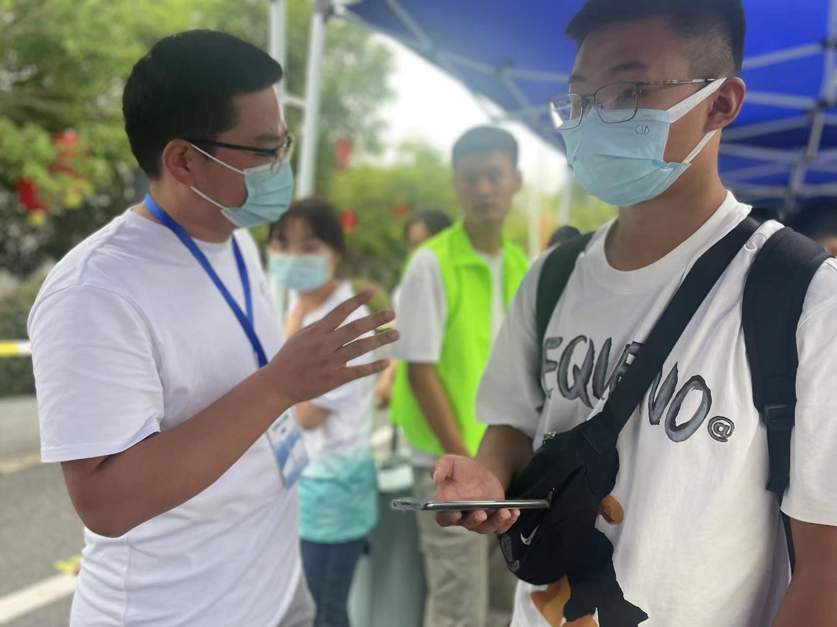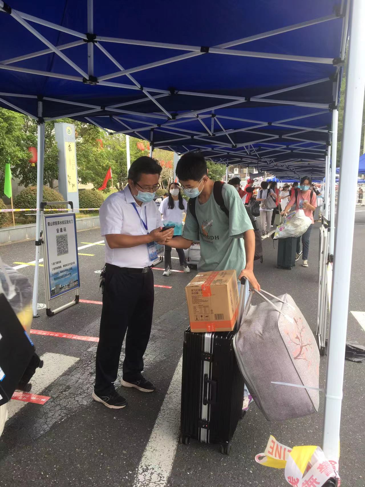 各小组成员在组长带领下协助来校的新生在最短的时间内完成身份证核验、安康码核验、路线引导等服务。