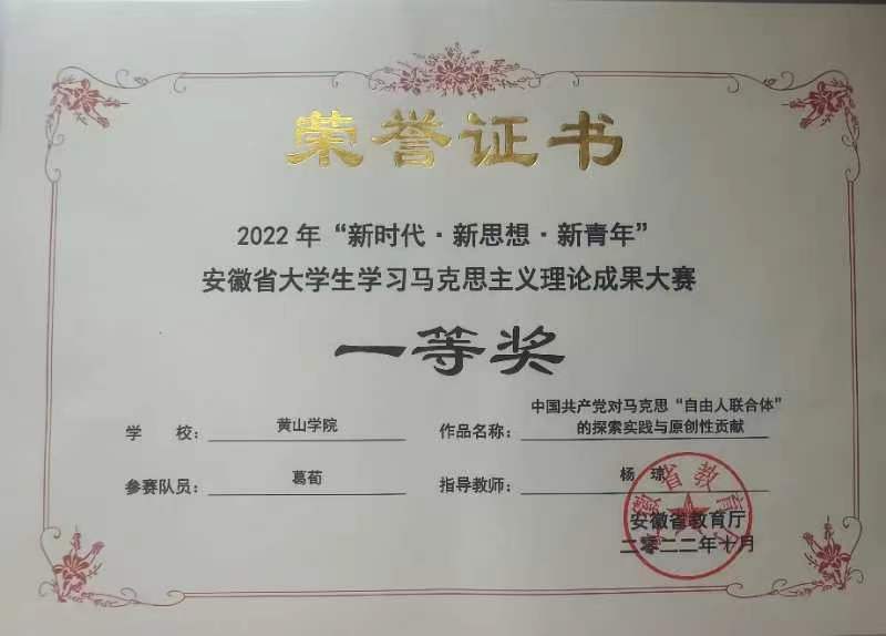 近日,由安徽省教育厅主办的2022年“新时代•新思想•新青年”安徽省大学生学习马克思主义理论成果大赛圆满落下帷幕。太阳集团网站8722副教授杨琼指导学生葛荀撰写的《中国共产党对马克思“自由人联合体”的探索实践与原创性贡献》荣获研究论文类一等奖,杨琼老师获优秀指导教师奖。