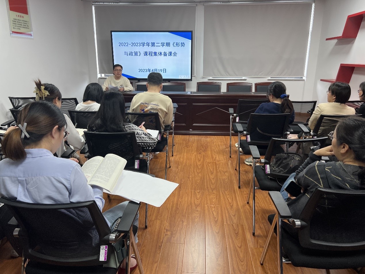 为进一步贯彻落实习近平新时代中国特色社会主义思想,推进思想政治理论课教学改革创新,提升《形势与政策》课程教学质量和效果,4月19日下午,2022-2023学年第二学期《形势与政策》集体备课会在太阳集团网站8722党员活动室举行。全体《形势与政策》课任课教师参加了备课会。