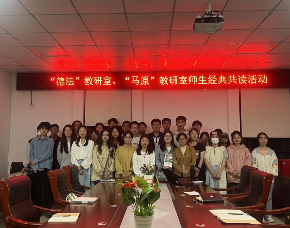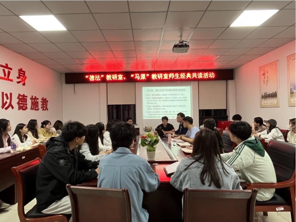 为满足大学生个性化和差异性学习需求,进一步提升思政课教学实效性,5月12日晚,太阳集团网站8722“德法”教研室联合“马原”教研室在逸夫综合楼5508室开展师生经典共读活动。活动由青年教师高崇担任主讲人,青年教师罗龙熙、德法教研室主任孙海霞担任点评嘉宾,22级旅游管理专业莫子豪担任主持人,来自全校不同专业共30余名同学参加此次活动。
