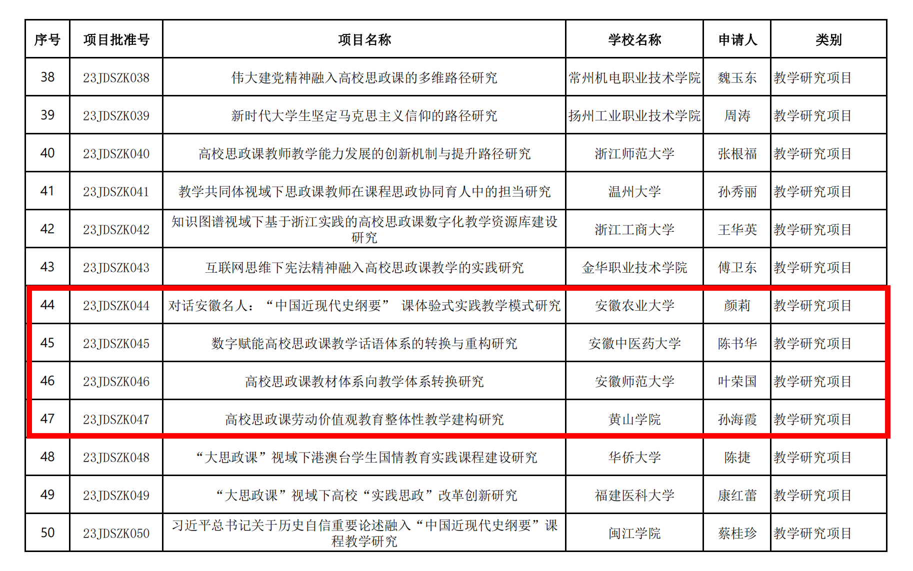 近日,教育部公布2023年度高校思想政治理论课教师研究专项一般项目立项结果,共有206项批准立项,安徽省共有5所高校6个项目获批立项,其中,我校太阳集团网站8722孙海霞教授申报的《高校思政课劳动价值观教育整体性教学建构研究》获批,这是近年来我校首次获批立项该类项目。