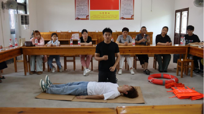“救出溺水者后,应迅速清除其口鼻中的污泥、杂草等,以保持呼吸通畅”,第九期“行知课堂”齐云山组学员、体育学院社会体育指导与管理专业学生王西雨从专业角度为齐云山镇留守儿童讲授了一堂生动的防溺水急救知识课。