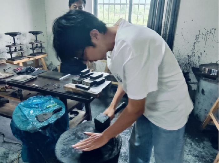 走进绩溪县上庄老胡开文墨厂,了解胡开文其人其事,学习徽墨制作的传统工艺,观摩古法点烟及八宝五胆金墨等制作技艺。“匠人们在一宇天地里一心一意地制作出每一块墨的情景,光阴流转,徽墨似乎带领我们回到了过去。”第九期“行知课堂”上庄组学员、生命与环境科学学院生物技术专业学生崔浩田学习完锤墨工艺后激动地说。