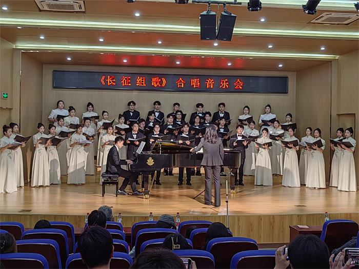 音乐会上,艺术学院曙音合唱团与音乐学专业部分教师合作演唱了《告别》《突破封锁线》《遵义会议放光辉》《四渡赤水出奇兵》《飞越大渡河》《过雪山草地》《到吴起镇》《祝捷》《报喜》和《大会师》等经典曲目,我院思政教师汪靓担任朗诵。悠扬的歌声与激昂的诵词相得益彰,深情讴歌了中国工农红军艰苦卓绝、英勇奋战的革命精神,为全场观众呈现了一堂生动的“舞台上的思政课”。