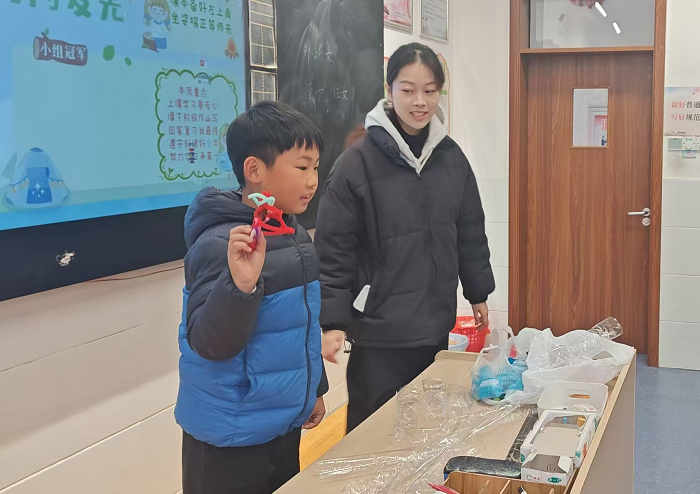 小老师们还给小学生们分发扭扭棒并带领小学生们进行手工创作。在创作过程中,小组成员耐心地指导小学生们如何操作,鼓励他们发挥想象力,创作出独一无二的作品。教室里创意作品不断涌现:五彩斑斓的蝴蝶、炫酷的眼镜、造型独特的发箍……孩子们沉浸其中,尽情享受手工创作的乐趣,欢笑声、交流声交织回荡。到了交流分享环节,孩子们高举作品,眼中满是自豪,走上讲台,分享他们在创作过程中的想法与感受。