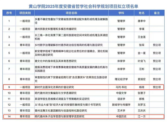 此次获批的项目聚焦时代需求与学术前沿,选题兼顾理论深度、实践价值及地域特色。杨琼老师主持的一般项目《新时代全面深化改革的价值论研究》,立足于习近平新时代中国特色社会主义思想,着眼全面深化改革这一推进中国式现代化的根本动力,为新时代安徽推进高质量发展、落实改革举措提供理论支撑与实践指引;江一方老师主持的青年项目《明代徽州朱子后学思想与新安理学流变研究》,旨在梳理新安理学(主要流传于徽州一带的朱子学重要分支之一)在明代的理论创新与演变历程,为构建现代社会价值观、倡导正确历史观等提供借鉴。